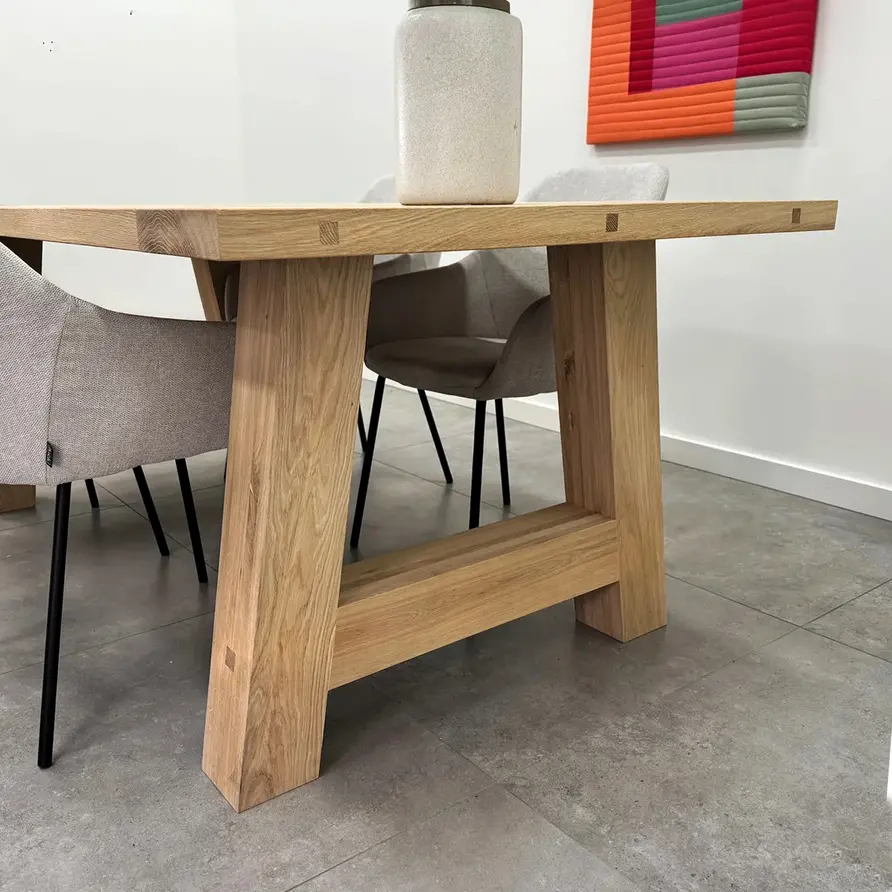Een kwalitatieve eikenhouten A poot: zeer sfeervol, waarbij de 12x12 cm maatvoering zorgt voor een robuust karakter. Het stevige gelijmde eikenhout, de mooie A-vorm, de robuuste 12x12 cm "balkmaat" en het sfeervolle eikenhout zorgen voor een prachtig eindresultaat. Ideaal te combineren met een eiken tafelblad! Ons rustiek Europees eikenhout heeft een "B-sortering zichtzijde" met charmante knoesten en scheurtjes: Levendig en natuurlijk eiken, ideaal voor een warme & sfeervolle uitstraling. Daarnaast wordt het oppervlak licht geborsteld, voor iets meer karakter.