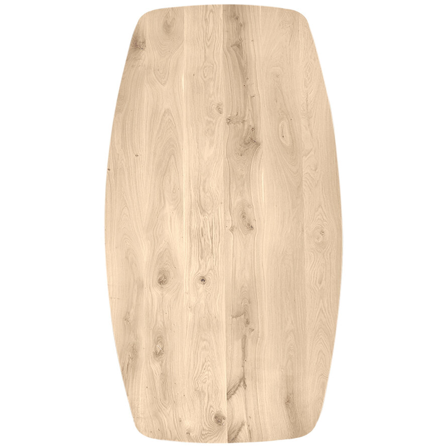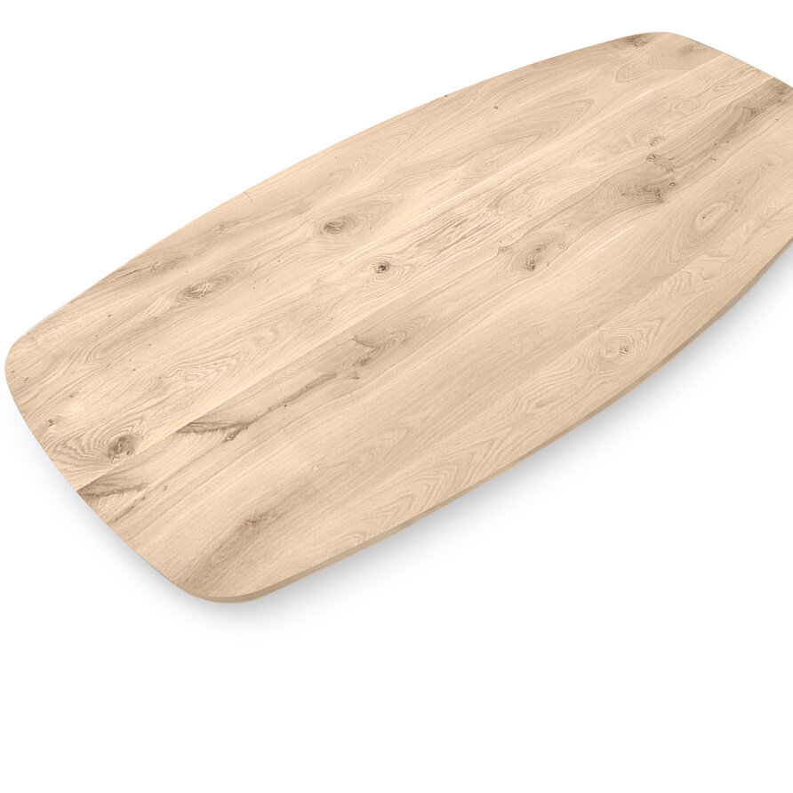 Deens ovaal eiken tafelblad met verjongde rand - 2,8 cm dik - rustiek eikenhout (B/C) - medium lamel (6-12 cm) - vaste afmetingen - gelijmd KD 8-12%