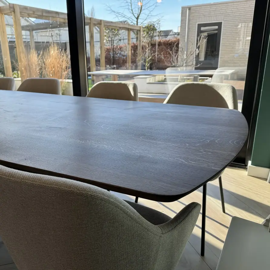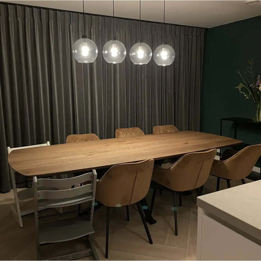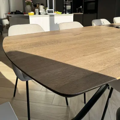 Al onze houten tafelbladen worden met de grootste zorg met de hand vervaardigd door ervaren vakmensen. Ons rustiek Europees eikenhout heeft een "B-sortering zichtzijde" met charmante knoesten en scheurtjes: Levendig en natuurlijk eiken, ideaal voor een warme & sfeervolle uitstraling. Een tafelblad bestaat uit doorlopende lamellen (in de lengte) van kunstmatig gedroogd eikenhout met een vochtpercentage van 8-12%, ideaal voor gebruik binnenshuis. De lamellen hebben een breedte tussen 6 en 12 cm, voor een mooi tafelblad met een luxe uitstraling. Uw eiken tafelblad wordt standaard onbehandeld, fijn geschuurd (korrel 120) en met scherpe randen afgeleverd. Kiest u voor een behandeling, dan worden de randen standaard afgerond. Er zijn echter verschillende extra mogelijkheden beschikbaar. U kunt alle extra opties vinden in de online configurator.