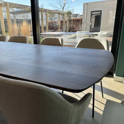 LET OP: Het verschil in breedte bij dit Deens ovale tafelblad, tussen het breedste deel (midden) en het dunste deel (uiteinden), is circa 10 cm. Aan de onderzijde worden standaard staalprofielen en "anti werkingsgroeven" aangebracht.