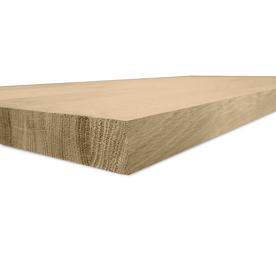 Eiken blad - fijnbezaagd - op maat - 4 cm dik - rustiek eikenhout (B/C) - smalle lamel (4-10 cm) - gelijmd eiken tablet - KD 8-12%