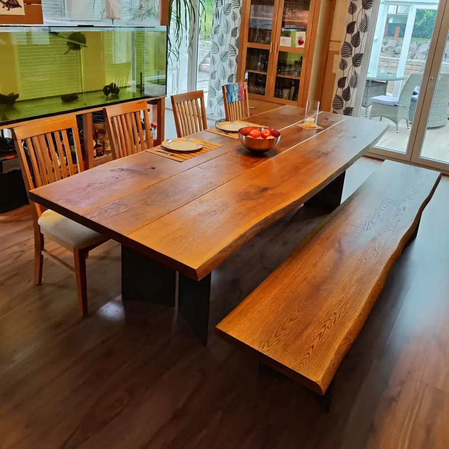 Een tafelblad bestaat uit doorlopende lamellen (in de lengte) van kunstmatig gedroogd eikenhout met een vochtpercentage van 8-12%, ideaal voor gebruik binnenshuis. Uw tafelblad wordt standaard opgebouwd uit 3 XXL lamellen, voor een bijzonder stijlvol tafelblad met een luxueze uitstraling. Uw eiken tafelblad wordt standaard onbehandeld, geborsteld, inclusief V-groeven en met scherpe randen afgeleverd. Kiest u voor een behandeling, dan worden de randen standaard afgerond. Er zijn echter verschillende extra mogelijkheden beschikbaar. U kunt alle extra opties vinden in de online configurator.