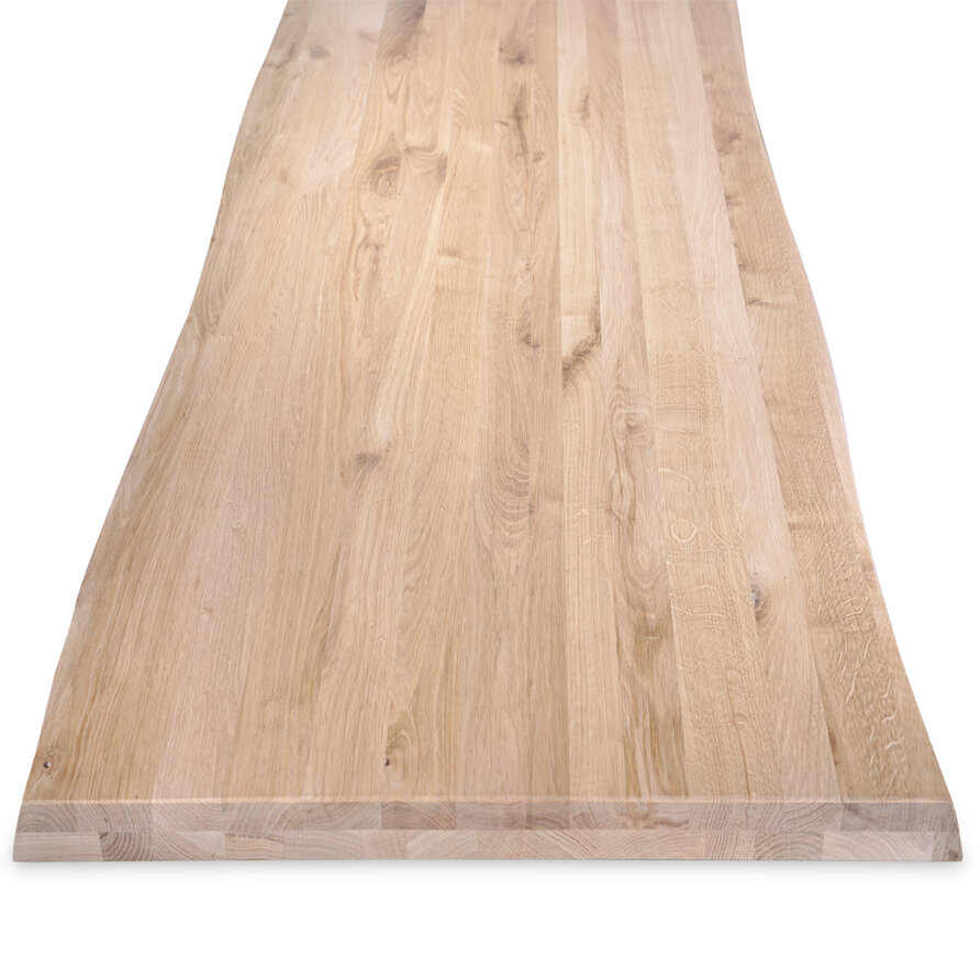 Ons rustiek Europees eikenhout heeft een "B-sortering zichtzijde" met charmante knoesten en scheurtjes: Levendig en natuurlijk eiken, ideaal voor een warme & sfeervolle uitstraling. Een tafelblad bestaat uit doorlopende lamellen (in de lengte) van kunstmatig gedroogd eikenhout met een vochtpercentage van 8-12%, ideaal voor gebruik binnenshuis. De lamellen hebben een breedte tussen 4 en 10 cm, wat een vrij gangbare lamelbreedte is. Uw op maat gemaakte eiken tafelblad wordt standaard onbehandeld, fijn geschuurd (korrel 120) en met afgeronde randen (2 mm radius) afgeleverd. Er zijn echter verschillende extra mogelijkheden beschikbaar. U kunt alle extra opties vinden in de online configurator.