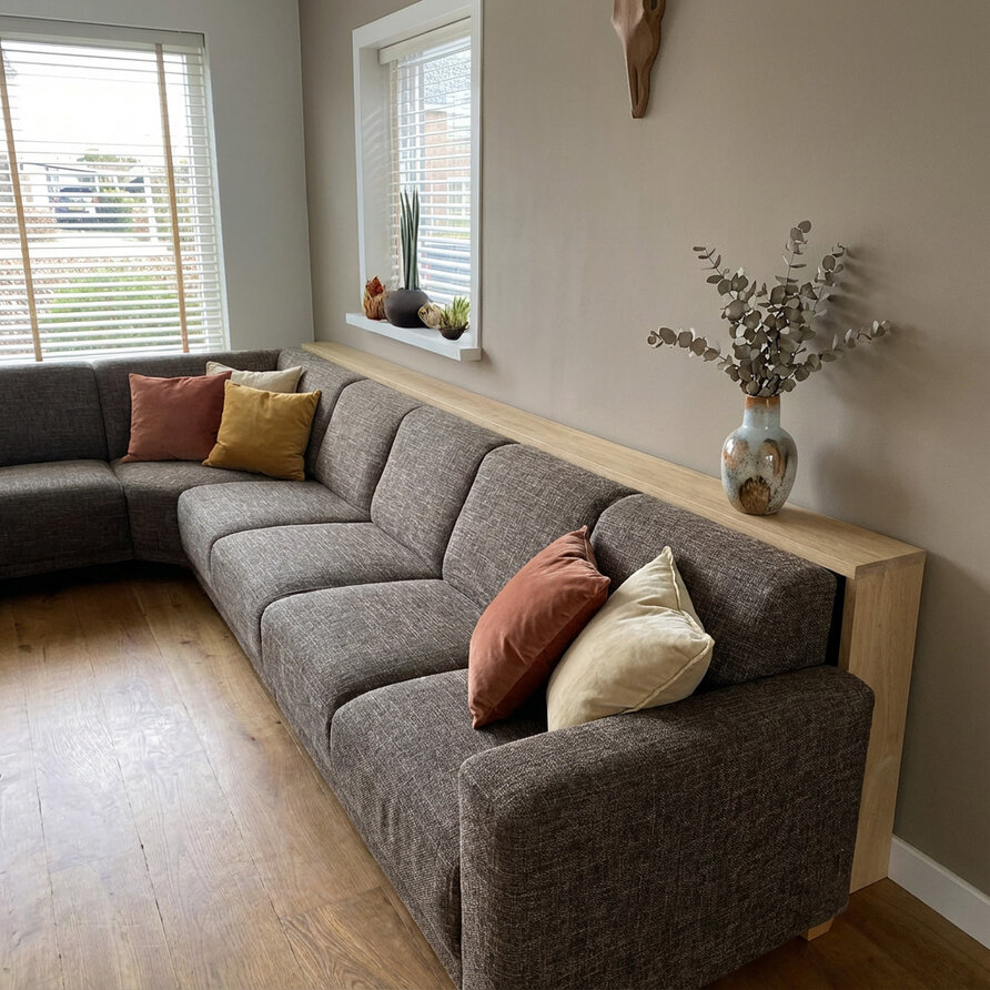 Een eiken side table (brede lamel) - voor achter de bank - van 2,7 cm dik, in een afmeting op maat, vervaardigd door vakmensen! Stijlvol & luxueus prime eikenhout. Incl. poten en diverse randafwerkingen mogelijk, stel uw muur/wand tafel naar wens samen! Lees meer