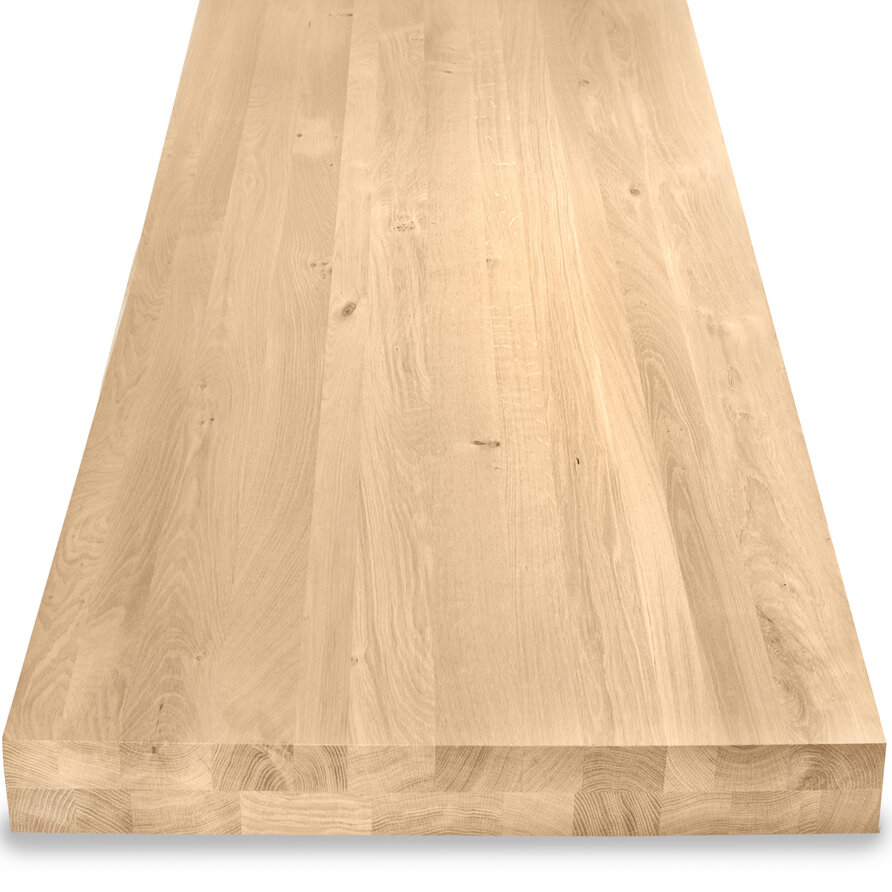 Eiken tafelblad - 2-laags massief - op maat - 8 cm dik (2 x 4 cm) - rustiek eikenhout (B/C) - smalle lamel (4-10 cm) - gelijmd eiken tafel- KD 8-12%. Een 2-laags eiken tafelblad volledig op maat en afgewerkt volgens uw wensen. Een 2-laags eiken tafelblad is volledig massief en bestaat uit twee (even dikke) lagen. Al onze eiken tafelbladen worden met de grootste zorg met de hand vervaardigd door ervaren vakmensen. Ons rustiek Europees eikenhout heeft een "B-sortering zichtzijde" met charmante knoesten en scheurtjes: Levendig en natuurlijk eiken, ideaal voor een warme & sfeervolle uitstraling. Een tafelblad bestaat uit doorlopende lamellen (in de lengte) van kunstmatig gedroogd eikenhout met een vochtpercentage van 8-12%, ideaal voor gebruik binnenshuis. De lamellen hebben een breedte tussen 4 en 10 cm, wat een vrij gangbare lamelbreedte is. Uw op maat gemaakte eiken tafelblad wordt standaard onbehandeld, fijn geschuurd (korrel 120) en met afgeronde randen (2 mm radius) afgeleverd. Er zijn echter verschillende extra mogelijkheden beschikbaar. U kunt alle extra opties vinden in de online configurator.