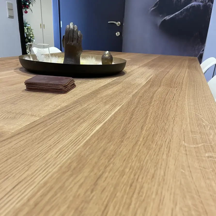 Een prime eiken tafelblad (brede lamel) van 2,7 cm dik, met de hand vervaardigd door ervaren vakmensen! Stijlvol & luxueus eikenhout voor binnen. Verkrijgbaar in vaste afmetingen en diverse randafwerkingen mogelijk, stel uw eiken tafel naar wens samen! Lees meer