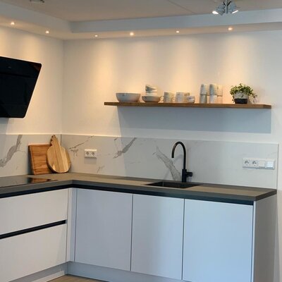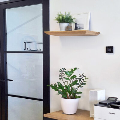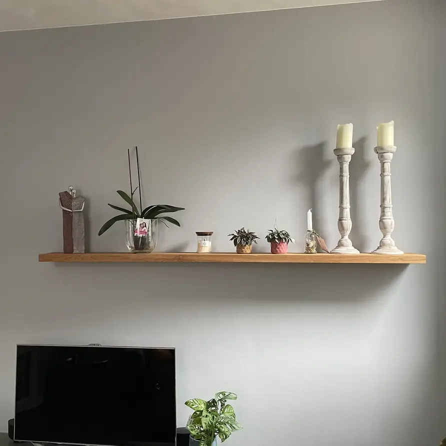 Een zwevende wandplank (brede lamel) van 4 cm dik prime eikenhout, inclusief onzichtbare plankdragers! Stijlvol & luxueus eikenhout voor aan de muur, met de hand vervaardigd. Stel uw schap / plank volledig op maat & naar wens samen. Lees meer
