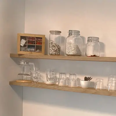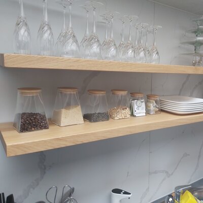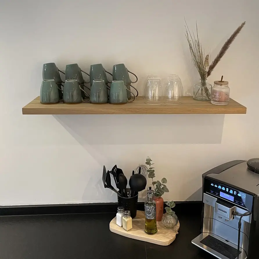Eiken wandplank zwevend - incl. onzichtbare plankdragers (beugels) - 4 cm dik - prime eikenhout (A/B) - brede lamel (9-12 cm) - gelijmd eiken muur plank / schap - KD 8-12%. Een prachtige eiken wandplank volledig op maat en afgewerkt volgens uw wensen. Al onze houten wandplanken worden met de grootste zorg met de hand vervaardigd door ervaren vakmensen. Ons prime Europees eikenhout heeft een "A-kwaliteit zichtzijde" (foutvrij) zonder knoesten: Stijlvol eiken, ideaal voor een luxueuze & sfeervolle uitstraling. Een eiken (boeken/keuken)plank voor aan de muur bestaat uit doorlopende lamellen (in de lengte) van kunstmatig gedroogd eikenhout met een vochtpercentage van 8-12%, ideaal voor gebruik binnenshuis. De lamellen hebben een breedte tussen 9 en 12 cm, voor een mooi blad met een luxe uitstraling.