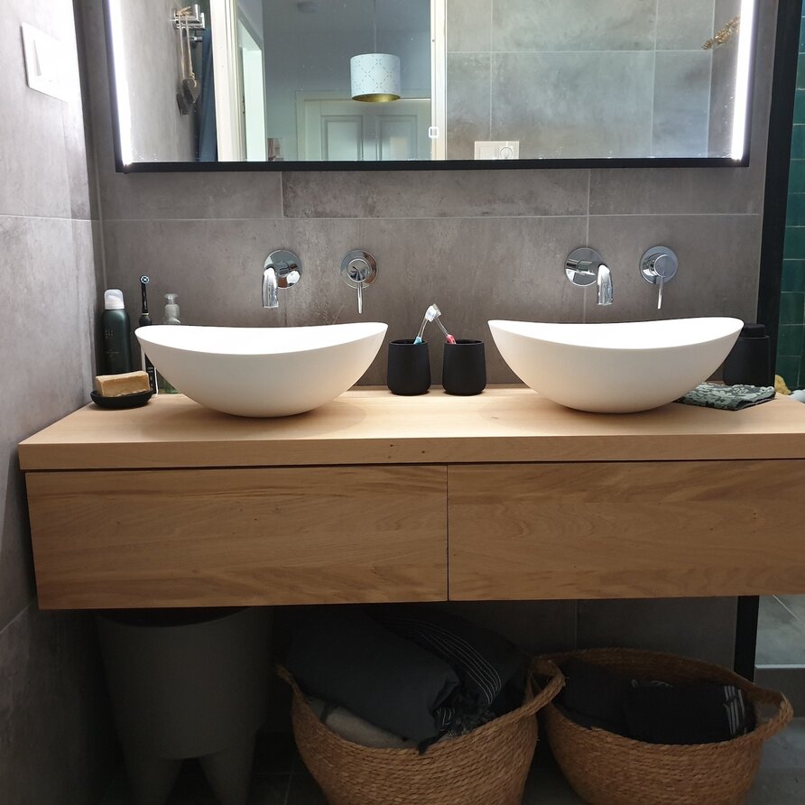 Een prime eiken wastafelblad (smalle lamel) van 3 cm dik op maat, met de hand vervaardigd door vakmensen! Met (max 4) gaten naar wens ideaal voor een opzet waskom / wasbak. Stijlvol & luxueus eikenhout met diverse randafwerkingen, stel naar wens samen! Lees meer