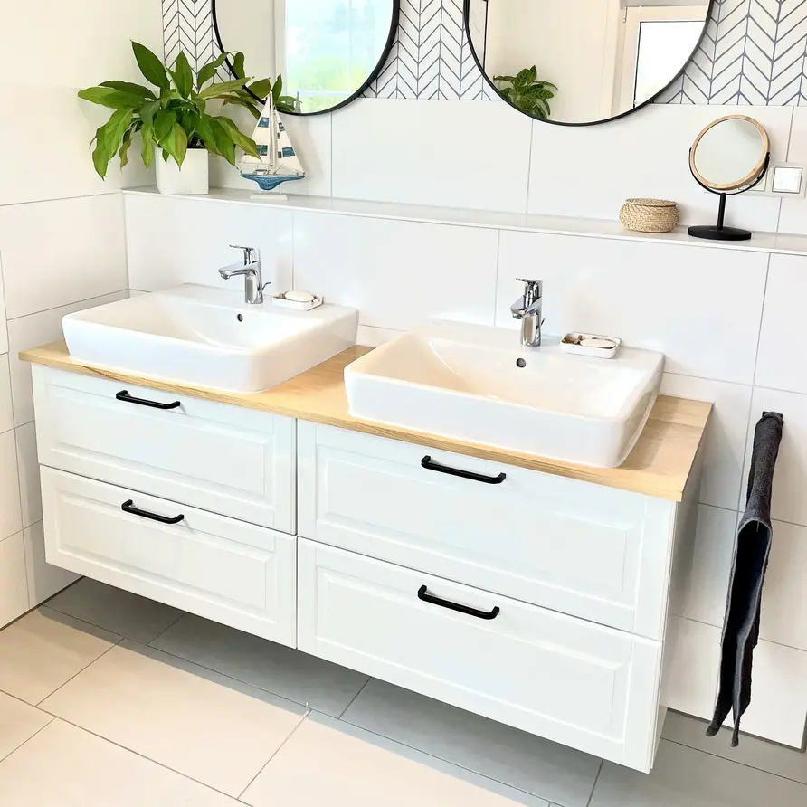 Eiken wastafelblad op maat - 4 cm dik - prime eikenhout (A/B) - smalle lamel (4-10 cm) - incl. (maximaal 4) gaten naar wens - gelijmd eiken waskom / wasbak plank - KD 8-12%. Een prachtige eiken wastafelblad volledig op maat en afgewerkt volgens uw wensen. Al onze houten wastafelbladen worden met de grootste zorg met de hand vervaardigd door ervaren vakmensen. Ons prime Europees eikenhout heeft een "A-kwaliteit zichtzijde" (foutvrij) zonder knoesten: Stijlvol eiken, ideaal voor een luxueuze & sfeervolle uitstraling. Een eiken opzet waskom / wasbak plank bestaat uit doorlopende lamellen (in de lengte) van kunstmatig gedroogd eikenhout met een vochtpercentage van 8-12%, ideaal voor gebruik binnenshuis. De lamellen hebben een breedte tussen 4 en 10 cm, wat een vrij gangbare lamelbreedte is.