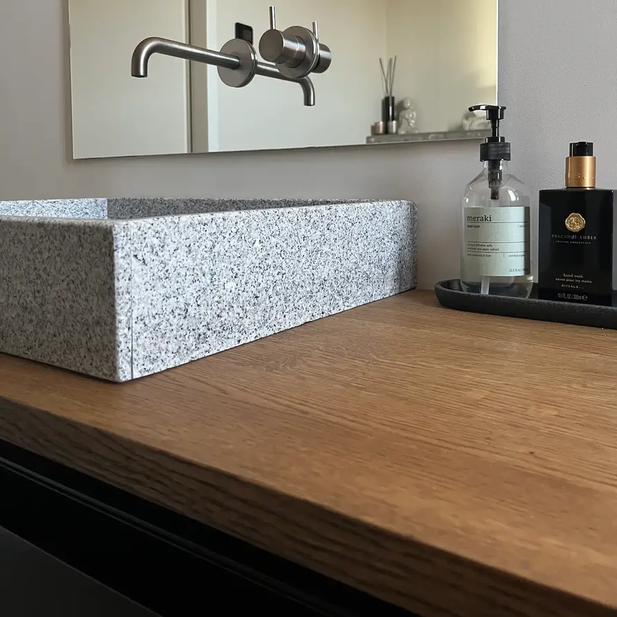 Een uniek eiken wastafelblad dat inclusief gaten (in een grootte & positie naar wens) wordt geleverd. Uw op maat gemaakte "plank" wordt standaard onbehandeld, fijn geschuurd (korrel 120) en met afgeronde randen (2 mm radius) afgeleverd. Er zijn daarnaast verschillende extra mogelijkheden beschikbaar. U kunt alle extra opties vinden in de online configurator.