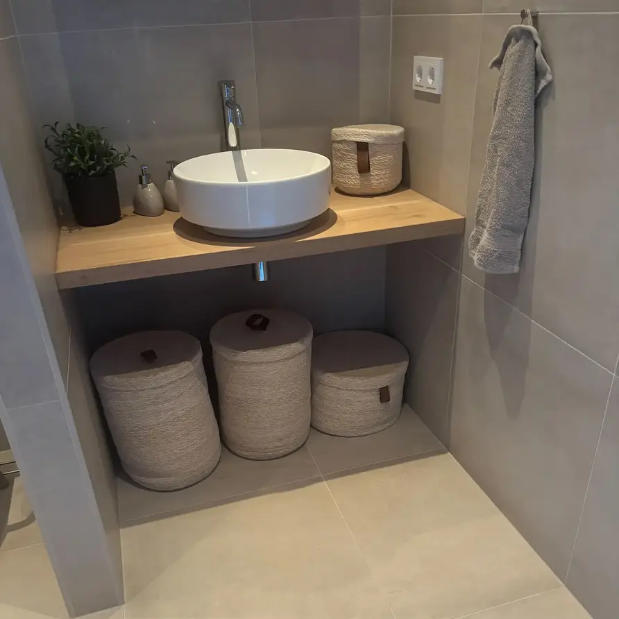 Een rustiek eiken wastafelblad (brede lamel) van 4 cm dik op maat, met de hand vervaardigd door vakmensen! Met (max 4) gaten naar wens ideaal voor een opzet waskom / wasbak. Warm & sfeervol eikenhout met diverse randafwerkingen, stel naar wens samen! Lees meer
