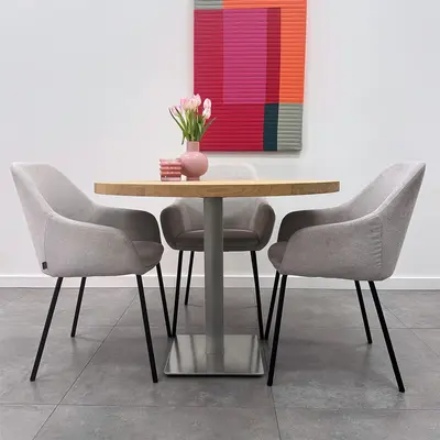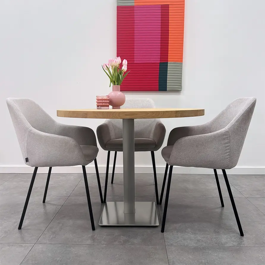 Een voordelig bistro / horeca tafelonderstel van gietijzer: Modern, mooi, praktisch en voordelig. Het stevige metaal, de praktische vorm en de moderne inox look poedercoating zorgen voor een prachtig eindresultaat: Een toegankelijk centraal tafelonderstel, erg mooi in combinatie met een (eiken)houten tafelblad, zowel rond als vierkant.