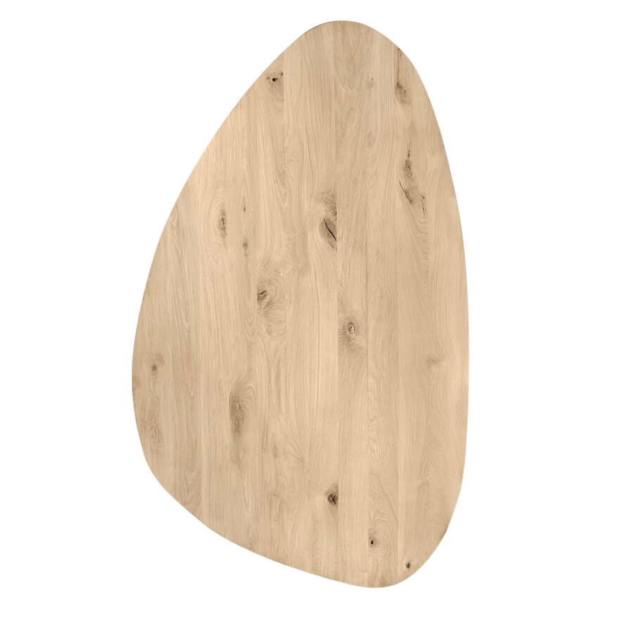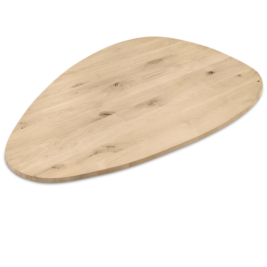 Eiken tafelblad - organisch / kiezel - 3 cm dik - rustiek eikenhout (B/C) - smalle lamel (4-10 cm) - gelijmd eiken tafel - KD 8-12%. Een mooi organisch eiken tafelblad, verkrijgbaar in diverse vaste afmetingen, afgewerkt volgens uw wensen. Een organisch eiken tafelblad is chic en apart, ideaal voor een trendy interieur. De kiezel vormgeving verenigt een natuurlijke look met een moderne uitstraling. Al onze houten tafelbladen worden met de grootste zorg met de hand vervaardigd door ervaren vakmensen. Ons rustiek Europees eikenhout heeft een "B-sortering zichtzijde" met charmante knoesten en scheurtjes: Levendig en natuurlijk eiken, ideaal voor een warme & sfeervolle uitstraling. Een tafelblad bestaat uit doorlopende lamellen (in de lengte) van kunstmatig gedroogd eikenhout met een vochtpercentage van 8-12%, ideaal voor gebruik binnenshuis. De lamellen hebben een breedte tussen 4 en 10 cm, wat een vrij gangbare lamelbreedte is. Uw eiken tafelblad wordt standaard onbehandeld, fijn geschuurd (korrel 120) en met afgeronde randen (2 mm radius) afgeleverd. Er zijn echter verschillende extra mogelijkheden beschikbaar. U kunt alle extra opties vinden in de online configurator.