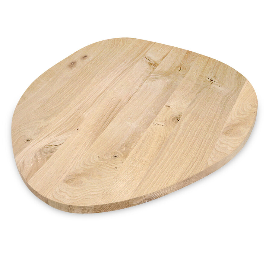 Eiken tafelblad - organisch / kiezel rond - 3 cm dik - rustiek eikenhout (B/C) - brede lamel (9-15 cm) - gelijmd eiken tafel- KD 8-12%. Een mooi "organisch rond" eiken tafelblad, verkrijgbaar in diverse vaste afmetingen, afgewerkt volgens uw wensen. Een organisch eiken tafelblad is chic, apart en uiterst handig voor in kleinere ruimtes. Deze ronde kiezel vormgeving verenigt een natuurlijke look met een moderne uitstraling. Al onze houten tafelbladen worden met de grootste zorg met de hand vervaardigd door ervaren vakmensen. Ons rustiek Europees eikenhout heeft een "B-sortering zichtzijde" met charmante knoesten en scheurtjes: Levendig en natuurlijk eiken, ideaal voor een warme & sfeervolle uitstraling.