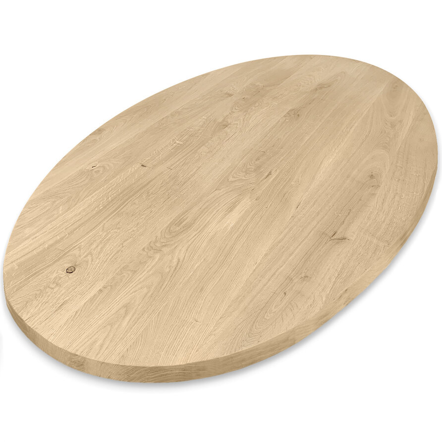 Ovaal eiken tafelblad - 4 cm dik - rustiek eikenhout (B/C) - brede lamel (9-12 cm) - vaste ellips afmetingen - gelijmd KD 8-12%
