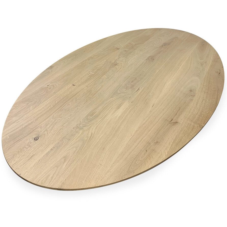 Ovaal / ellips eiken tafelblad met verjongde rand - 3 cm dik - rustiek eikenhout (B/C) - medium lamel (6-12 cm) - vaste afmetingen - gelijmd KD 8-12%