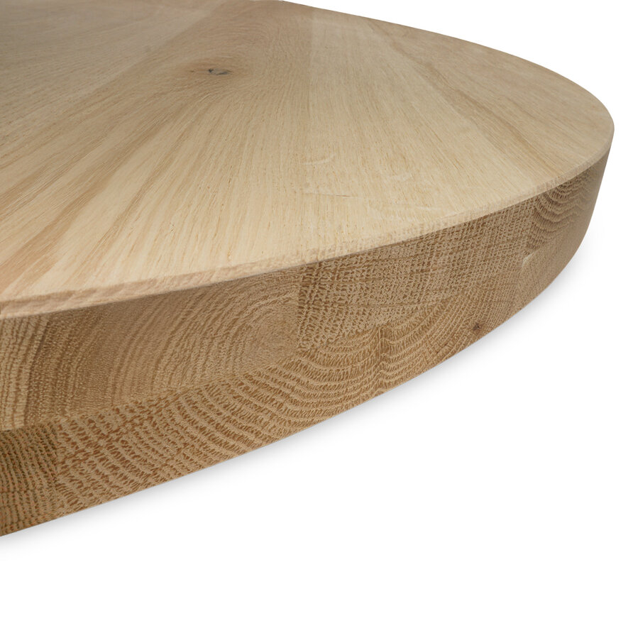 Eiken tafelblad - rond - op maat - 2-laags massief - op maat - 6 cm dik (2 x 3 cm) - rustiek eikenhout (B/C) - smalle lamel (4-10 cm) - gelijmd eiken tafel- KD 8-12%. Een 2-laags rond eiken tafelblad volledig op maat en afgewerkt volgens uw wensen. Een 2-laags eiken tafelblad is volledig massief en bestaat uit twee (even dikke) lagen. Een rond eiken tafelblad is chic, knus en uiterst handig voor in kleinere ruimtes. Al onze houten tafelbladen worden met de grootste zorg met de hand vervaardigd door ervaren vakmensen. Ons rustiek Europees eikenhout heeft een "B-sortering zichtzijde" met charmante knoesten en scheurtjes: Levendig en natuurlijk eiken, ideaal voor een warme & sfeervolle uitstraling. Een tafelblad bestaat uit doorlopende lamellen (in de lengte) van kunstmatig gedroogd eikenhout met een vochtpercentage van 8-12%, ideaal voor gebruik binnenshuis. De lamellen hebben een breedte tussen 4 en 10 cm, wat een vrij gangbare lamelbreedte is. Uw op maat gemaakte eiken tafelblad wordt standaard onbehandeld, fijn geschuurd (korrel 120) en met afgeronde randen (2 mm radius) afgeleverd. Er zijn echter verschillende extra mogelijkheden beschikbaar. U kunt alle extra opties vinden in de online configurator.