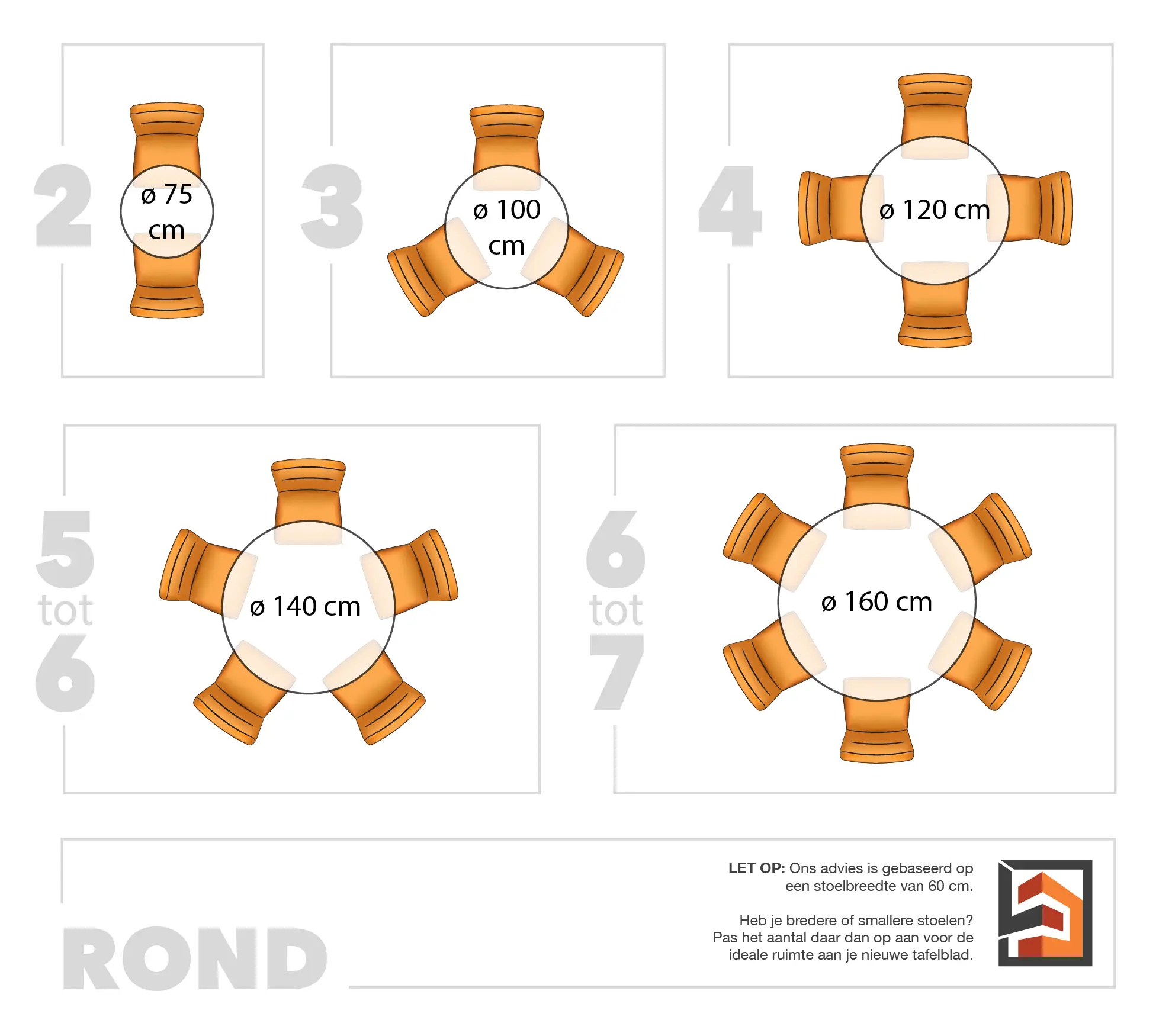 De ronde tafel is gezellig, stijlvol, ruimtebesparend en zeer praktisch. Doordat er geen hoeken zijn is er onderling prettig contact aan tafel. Bij een ronde tafel zijn de breedte van de stoel en de ruimte tussen de stoelen van grote invloed op het aantal stoelen dat geplaatst kan worden. Kiest u voor een smalle stoel (van 40-45 cm) en een minimale ruimte (van circa 5 cm) tussen de stoelen, dan zijn er meer zitplaatsen te realiseren.