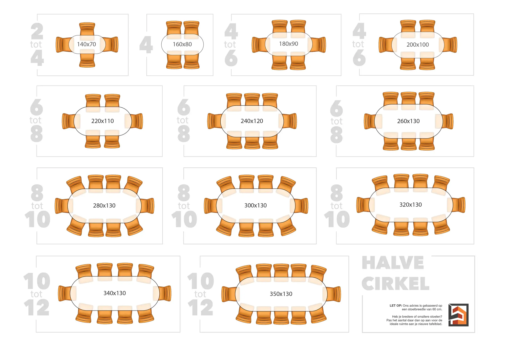 Een tafel met halfronde uiteinden is een stijlvolle tafelvorm met een klassieke uitstraling. Bij dit type tafel is het mogelijk om een stoel aan de kopse kant te plaatsen. Houd er echter rekening mee dat er aan de uiterste zijden iets minder ruimte is dan bij een rechte tafel. Door de ronding hebben deze zitplaatsen minder tafeloppervlak en beenruimte. Wij adviseren daarom om altijd wat extra marge aan te houden. Ga uit van iets meer ruimte per stoel en tussen de stoelen voor een optimaal zitcomfort.