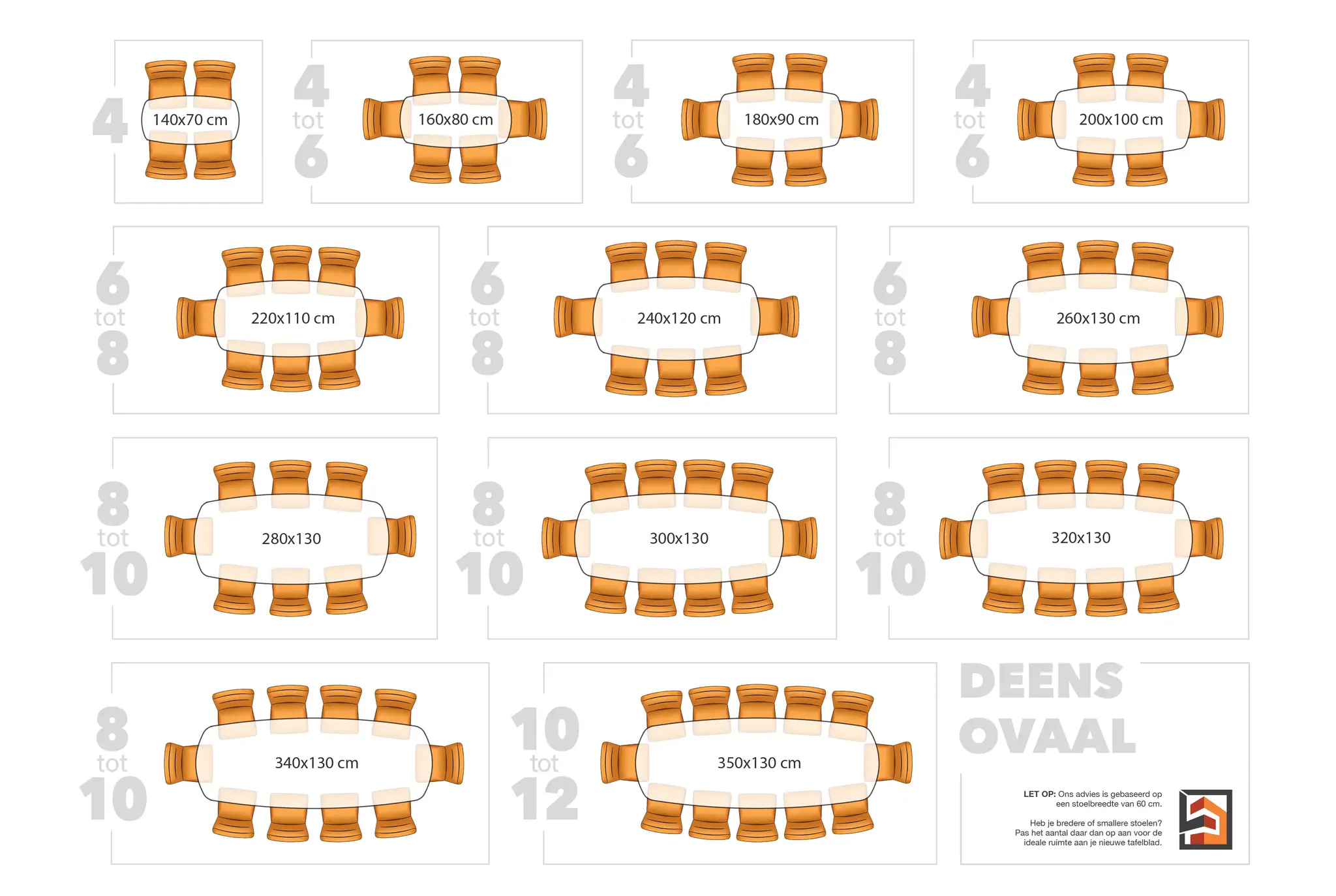 De Deens ovale tafel is een stijlvolle en populaire tafelvorm die de praktische voordelen van een rechthoekige tafel combineert met een moderne look. Dankzij de vrijwel rechte zijden benut u de ruimte efficiënt en creëert u eenvoudig extra zitplaatsen. De afgeronde uiteinden hebben nauwelijks invloed op het aantal stoelen en aan de kopse kanten kan prima een stoel worden. Wij hanteren een minimale breedte van 80 cm voor het plaatsen van een stoel aan de kopse kant.